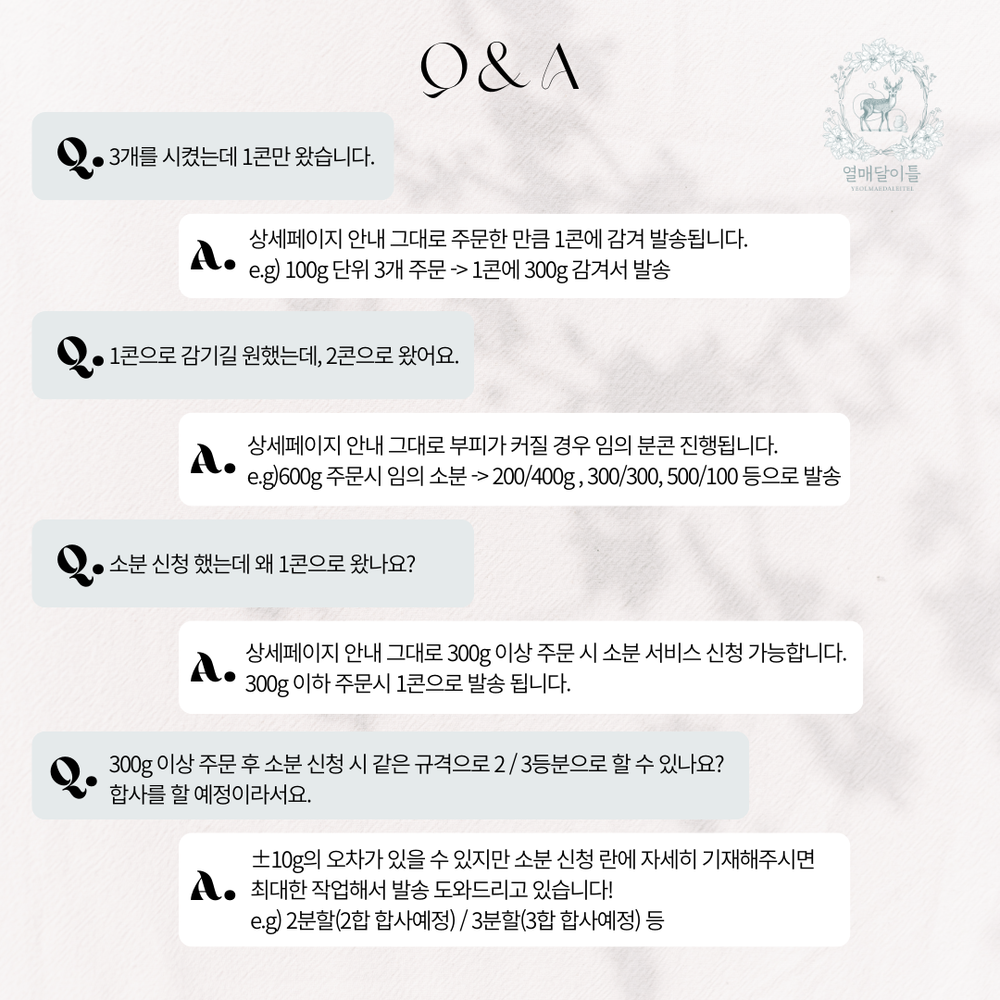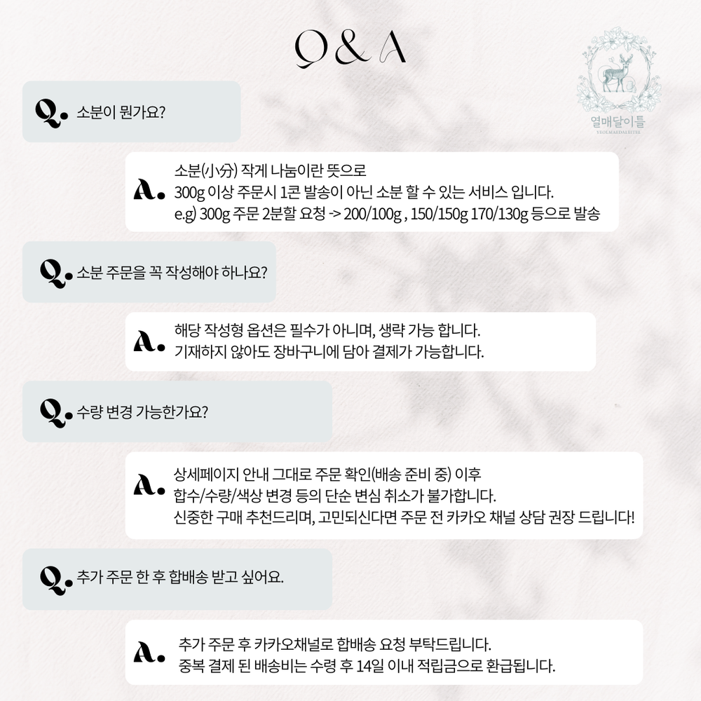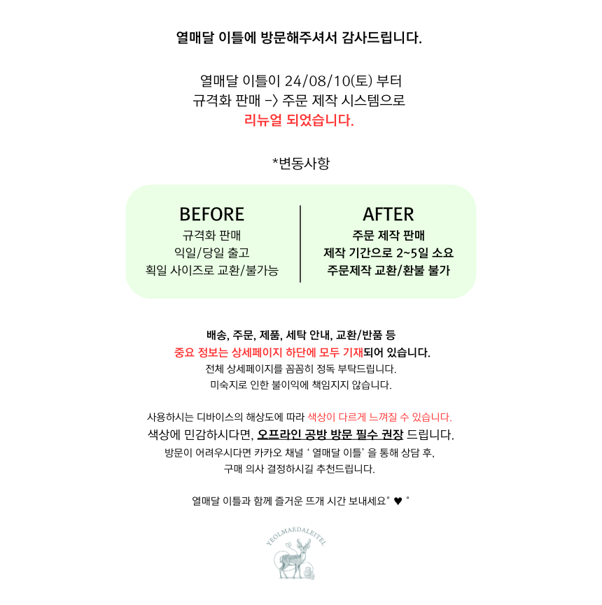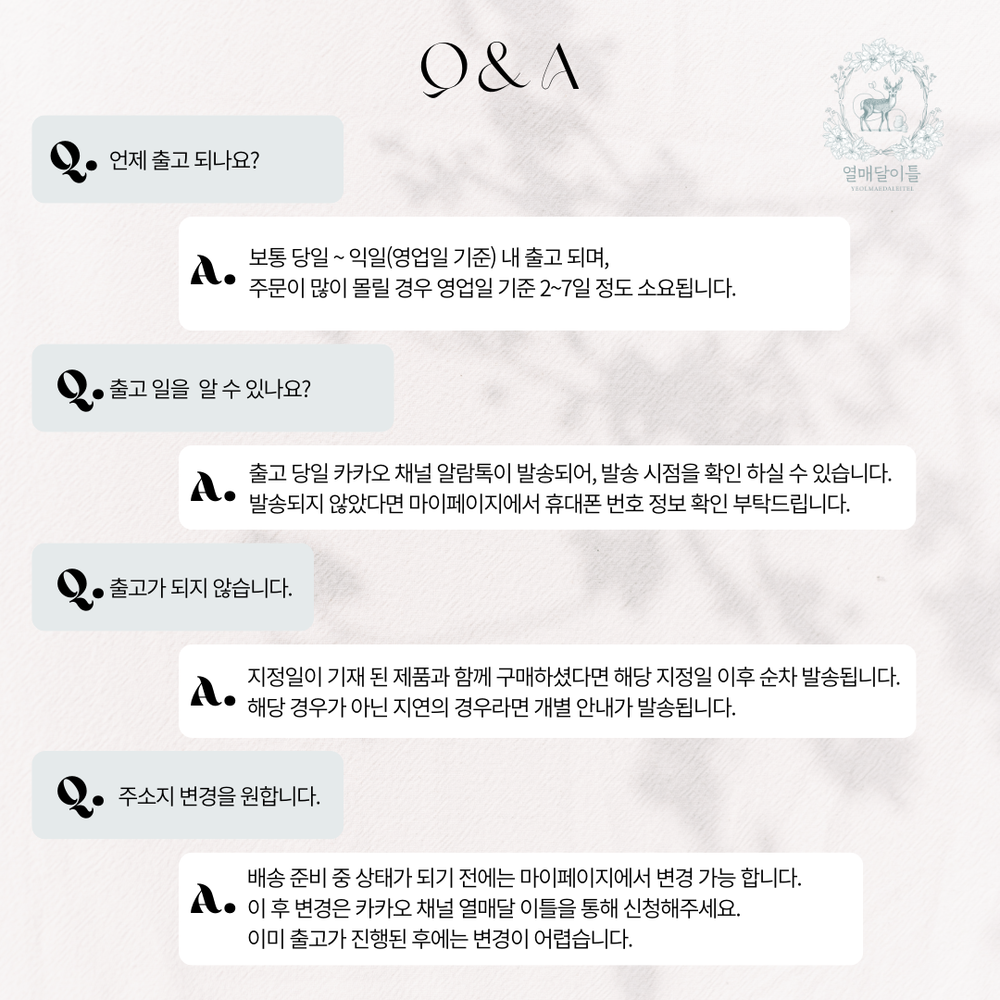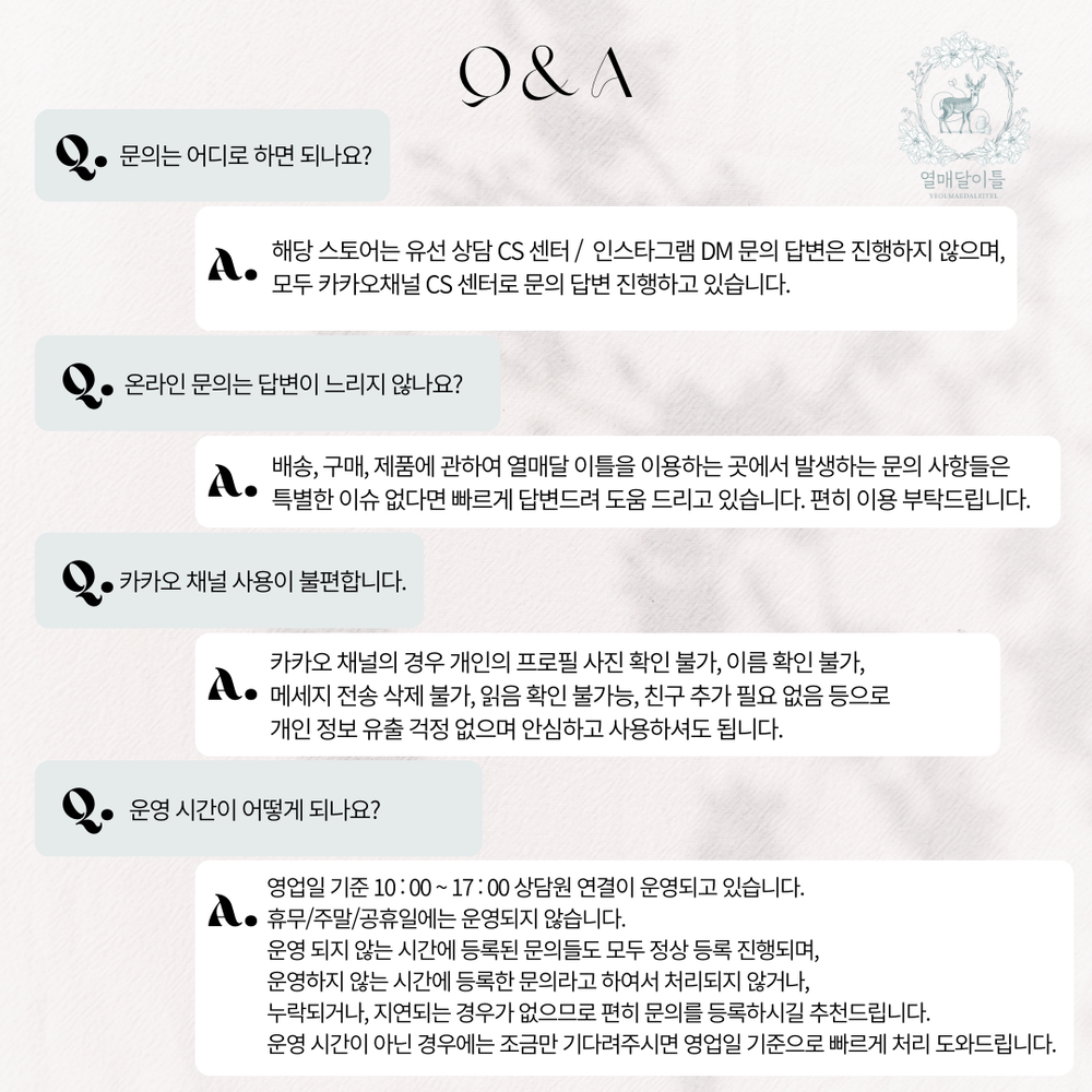 해당 스토어의 모든 문의 상담은 유선상담이 아닌, 카카오채널 '열매달 이틀' 을 통하여