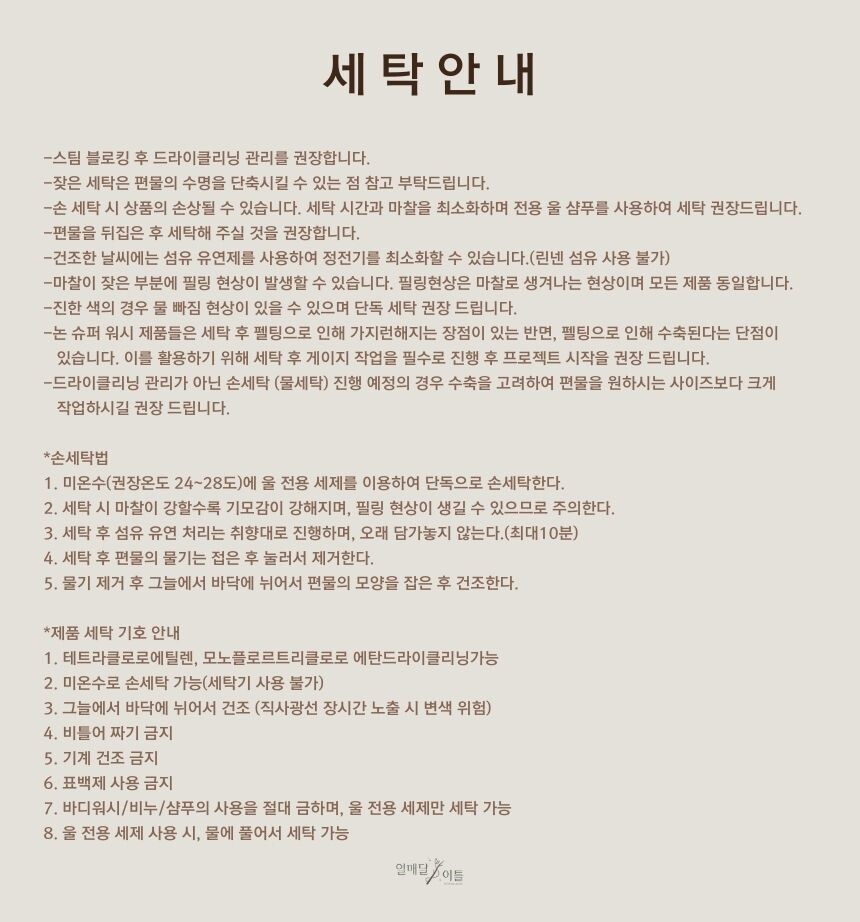*첫 세탁은 단독세탁 권장합니다. 진한색은 물빠짐이 있을 수 있으므로 2~3번은 단독세탁 부탁드립니다.