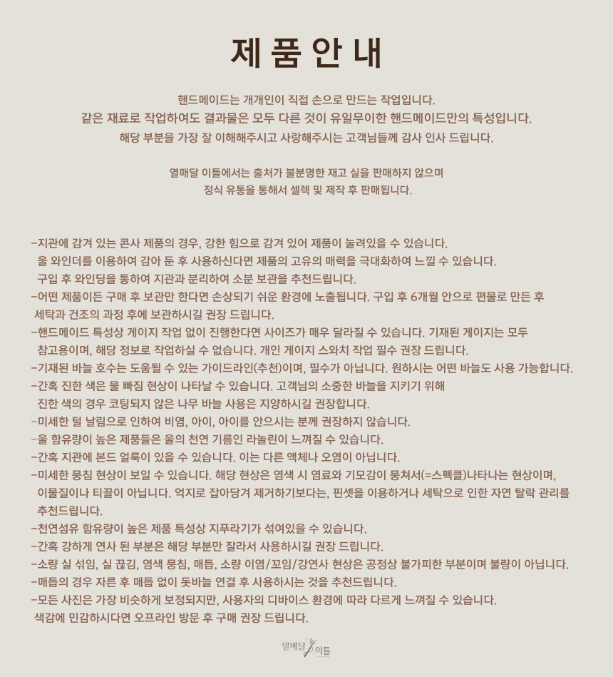 * 원사 공정 과정에서 실의 뭉친 부분과 매듭이 있을 수 있지만 꼭 필요한 과정으로 불량이 아닙니다.